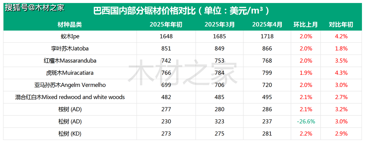 此中,亚马孙苏木、蚁木和孪叶苏木表示最为强劲,对比3月环比涨幅均冲破2%。取岁首年月价钱比拟,亚马孙苏木以6。1%的累计涨幅领先,虎斑木、夹杂红白木紧随其后,别离上涨3。3%和3。4%。值得留意的是,蚁木岁首年月至今虽微跌1。9%,但近期已呈现触底反弹趋向。4月,蚁木、孪叶苏木和红檀木锯材价钱环比均涨2%,较岁首年月累计涨幅最高达4。2%。而虎斑木、亚马孙苏木等品种锯材价钱亦连结1。9%-2。1%的暖和增加。