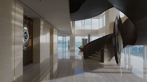 步入「天际会客堂」,最先映入眼皮的,即是由珊瑚和贝壳化石构成的天然玉石墙,如波浪般延长的威尼斯木纹地面,搭配上亿年海洋生物化石——海贝花欢迎台,海洋的气味劈面而来,传送天然纯粹的海上糊口立场。天然木皮拼接而成的扭转楼梯,自下而上发展,展示生命的无限力量,做为一二层联动,空间的边界似有似无,呈现有界空间、糊口。![]()