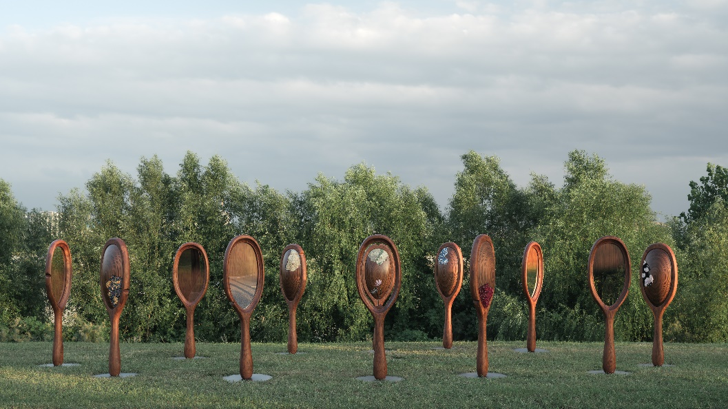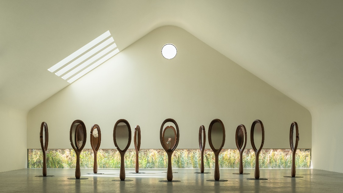 她设计了十二枚镜面,构成一个椭圆形装置,象征生命的循环往复与时间的永恒流动。每一枚镜子背后展示了对应月份的花卉,象征自然界的变化与生命的节奏。镜面采用了特别定制的幽灵镜效果,具有渐变的反射能力;使观众在镜前不仅能看到自己的倒影,还能模糊地感知到背景中的年轮图案。这种交互效果使得观众的身影与自然的纹理相融合,增强了人与自然的连接感。观众可以在镜面之间随意走动,观察不同镜面的花卉与自己的倒影,与时间对话,回顾过去、审视现在并展望未来。