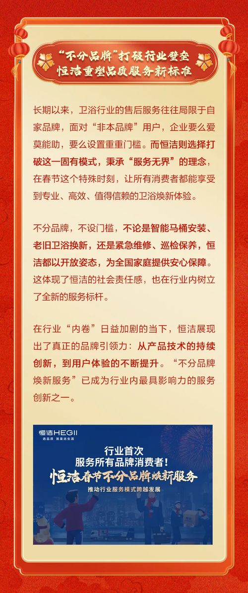 2025年春节之际,恒洁奉行的“不分品牌焕新办事”好像璀璨炊火,正在消费者心中留下深刻的印记。这项独具立异的行动,像是一股清爽的风,整个卫浴行业。恒洁打破了保守品牌的,不设门槛,令每一位用户都能感遭到其带来的高质量卫浴焕新体验。将办事之界化做无形,为行业树立了新的标杆。恒洁的这一步履不只博得了消费者的普遍赞誉,更鞭策了卫浴行业办事模式的升级取变化。从专业到贴心,恒洁以现实步履注释了“办事,焕新万家”的国货担任。