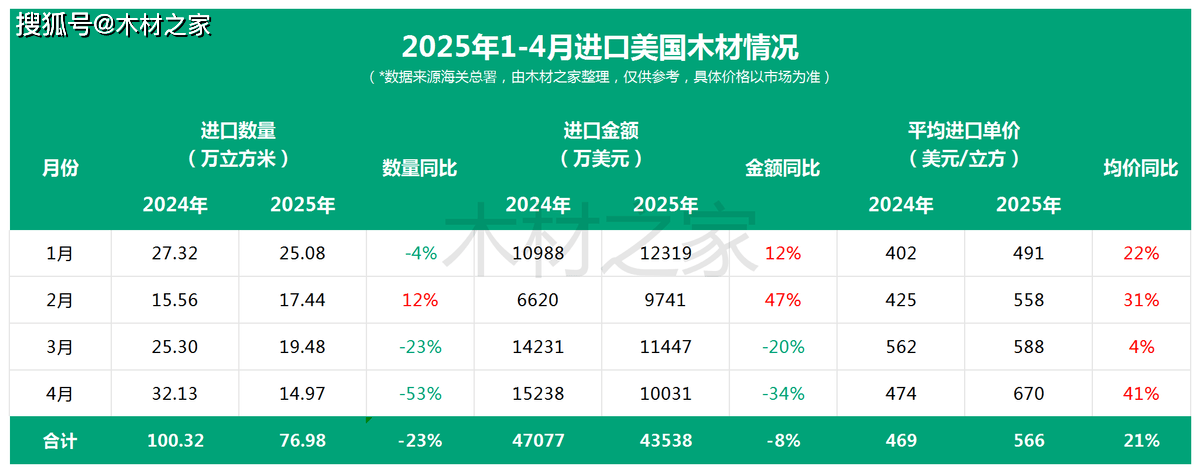 海关总署发布的4月木材进口数据显示,该月份中国对美国木材进口数量同比大幅缩减53%;进口金额同比收缩34%,环比下降23%。此中,原木进口量仅为6万立方米,同比锐减71%,环比下滑36%;锯材进口量8。96万立方米,同比削减21%,环比下降11%。这一断崖式下跌取3月中方颁布发表“暂缓美国原木进口”的政策亲近相关。阐发指出,3月的政策调整导致商业商提前削减采购,叠加4月初中美因关税问题僵持不下、双边商业短暂停畅,使得4月数据成为政策效应的“线月初,中美两国发布《中美经贸漫谈结合声明》,颁布发表就多项关税问题告竣共识,并打算于2025年5月14日前落实具体办法。这一冲破性进展敏捷激活市场:部门企业为规避将来政策变更风险,起头加快取美国供应商沟通,力争正在关税窗口期内完成积压订单。对此,我们估计6月对美木材进口量以及对美木制家具出口或将短期回升,而因为船期问题,5月到港船只多为4月份的订单,因而该月进口数据或将仍处于低迷形态。