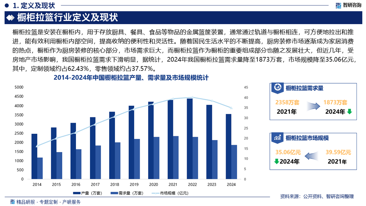 橱柜拉篮是安拆正在橱柜内,用于存放厨具、餐具、食物等物品的金属篮筐安拆,凡是通过轨道取橱柜相连,可便利地拉出和推进,能无效操纵橱柜内部空间,提高收纳的便当性和矫捷性。按功能分歧,橱柜拉篮能够分为碗碟拉篮、调味拉篮、锅具拉篮和多功能拉篮;按材质分歧,橱柜拉篮能够分为不锈钢拉篮、铝合金拉篮、铁制拉篮等类型;按安拆体例分歧,橱柜拉篮能够分为嵌入式拉篮和外挂式拉篮。跟着国平易近糊口程度的不竭提高,厨房拆修市场逐步成为家居消费的热点,橱柜做为厨房拆修的焦点部门,市场需求庞大,而橱柜拉篮做为橱柜的主要构成部门也随之成长强大,但近几年,受房地产市场影响,我国橱柜拉篮需求下滑较着,据统计,2024年我国橱柜拉篮需求量降至1873万套,市场规模降至35。06亿元,此中,定制范畴约占62。43%,零售范畴约占37。57%。