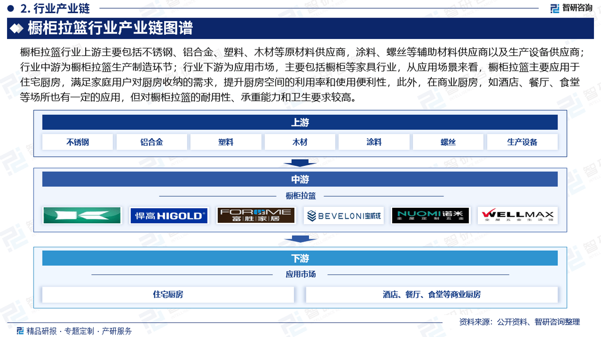 橱柜拉篮行业上逛次要包罗不锈钢、铝合金、塑料、木材等原材料供应商,涂料、螺丝等辅帮材料供应商以及出产设备供应商;行业中逛为橱柜拉篮出产制制环节;行业下逛为使用市场,次要包罗橱柜等家具行业,从使用场景来看,橱柜拉篮次要使用于室第厨房,满脚家庭用户对厨房收纳的需求,提拔厨房空间的操纵率和利用便当性,此外,正在贸易厨房,如酒店、餐厅、食堂等场合也有必然的使用,但对橱柜拉篮的耐用性、