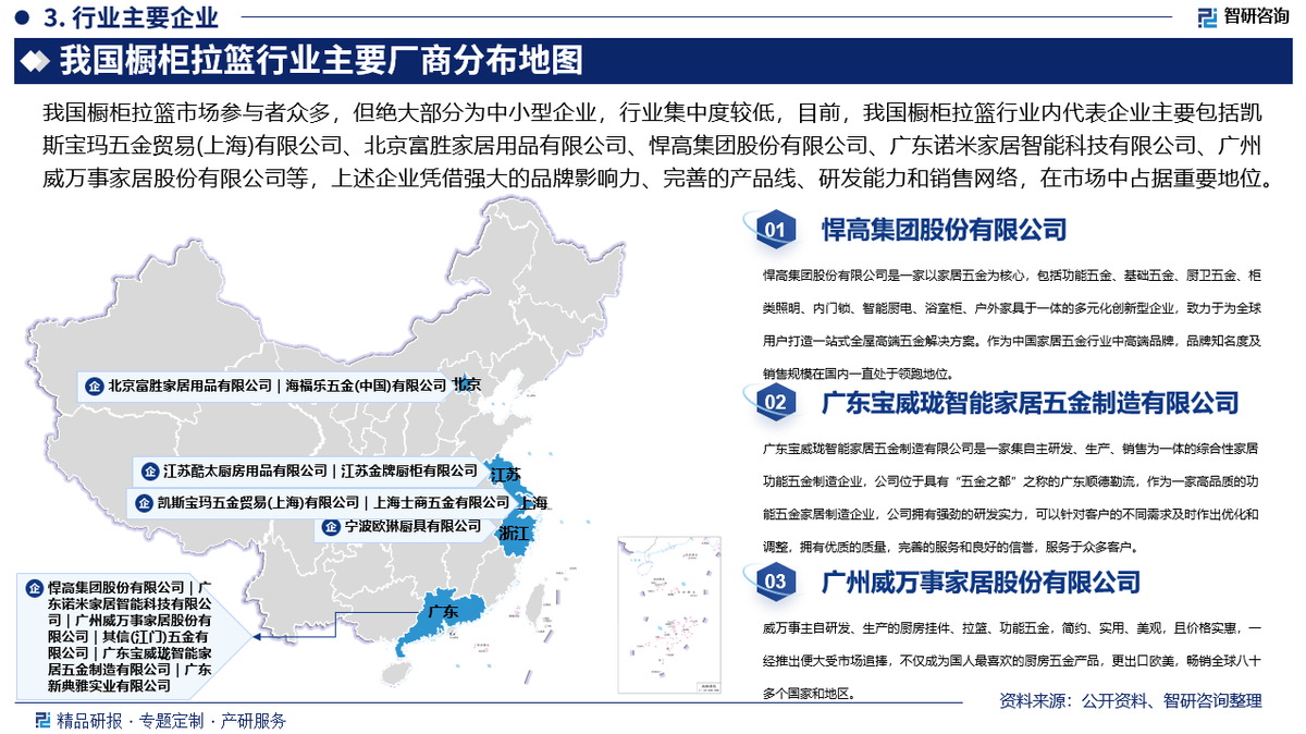 我国橱柜拉篮市场参取者浩繁,但绝大部门为中小型企业,行业集中度较低,目前,我国橱柜拉篮行业内代表企业次要包罗凯斯宝玛五金商业(上海)无限公司、富胜家居用品无限公司、悍高集团股份无限公司、广东诺米家居智能科技无限公司、广州威万事家居股份无限公司、海福乐五金(中国)无限公司、宁波欧琳厨具无限公司、其信(江门)五金无限公司、上海士商五金无限公司、江苏酷太厨房用品无限公司、广东宝威珑智能家居五金制制无限公司等,上述企业凭仗强大的品牌影响力、完美的产物线、研发能力和发卖收集,正在市场中占领主要地位。