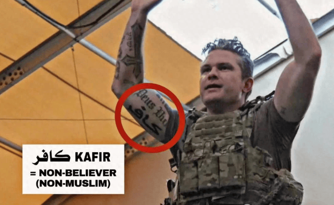近日,美国长赫格塞斯正在关岛秀出左臂新纹身时,可能没认识到这个阿拉伯语单词“كافر”(异)正正在点燃全球火药桶。这位满身布满17处刺青的政坛异类,从希伯来神名到殖平易近期间蛇标,每寸皮肤都正在讲述美式霸权的荒唐脚本。