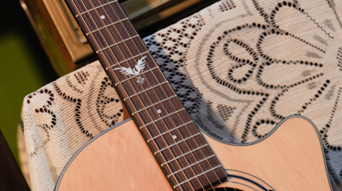背侧板选用的洲桃花芯木,这种木材质地平均、纹理美妙,不只正在视觉上给人带来舒服感,更能为吉他供给结实且温暖的低频支持,让全体音色愈加丰满平衡,无论是弹奏平易近谣仍是指弹曲目,都能轻松把握,展示出强大的顺应性。