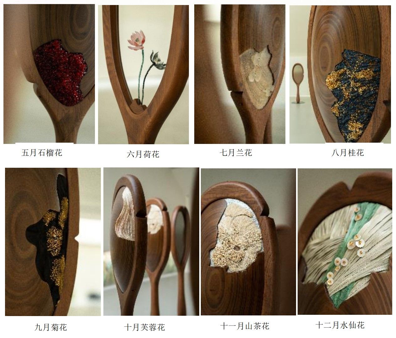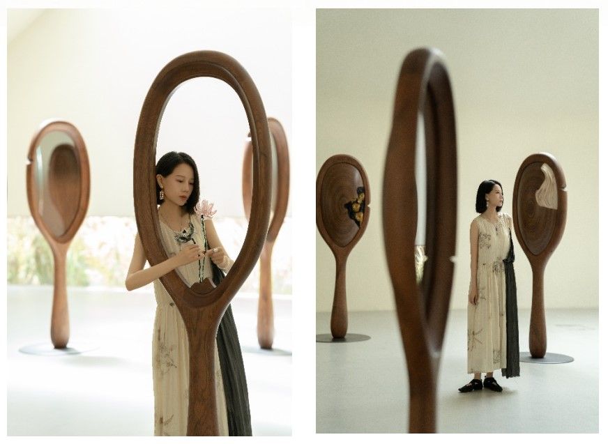 她设计了十二枚镜面,构成一个椭圆形装置,象征生命的循环往复与时间的永恒流动。每一枚镜子背后展示了对应月份的花卉,象征自然界的变化与生命的节奏。镜面采用了特别定制的幽灵镜效果,具有渐变的反射能力;使观众在镜前不仅能看到自己的倒影,还能模糊地感知到背景中的年轮图案。这种交互效果使得观众的身影与自然的纹理相融合,增强了人与自然的连接感。观众可以在镜面之间随意走动,观察不同镜面的花卉与自己的倒影,与时间对话,回顾过去、审视现在并展望未来。