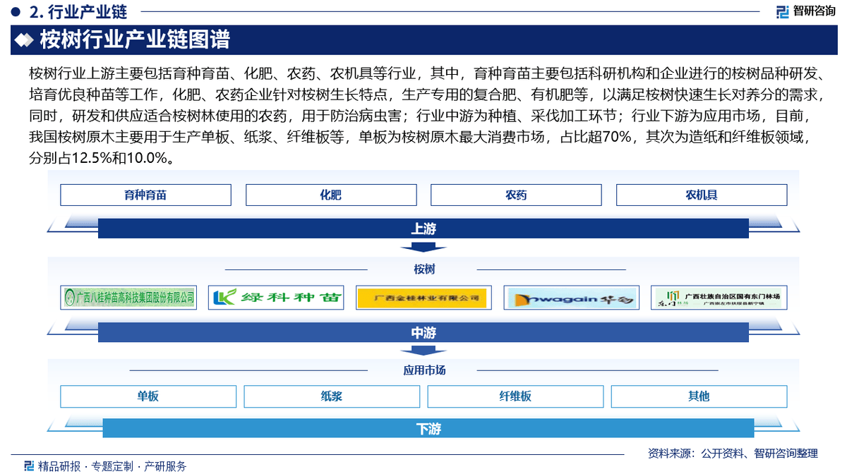桉树行业上逛次要包罗育种育苗、化肥、农药、农机具等行业,此中,育种育苗次要包罗科研机构和企业进行的桉树品种研发、培育优秀种苗等工做,化肥、农药企业针对桉树发展特点,出产公用的复合肥、以满脚桉树快速发展对养分的需求,同时,研发和供应适合桉树林利用的农药,用于防治病虫害;行业中逛为种植、采伐加工环节;行业下逛为使用市场,目前,我国桉树原木次要用于出产单板、纸浆、纤维板等,单板为桉树原木最大消费市场,占比超70%,其次为制纸和纤维板范畴,别离占12。5%和10。0%。